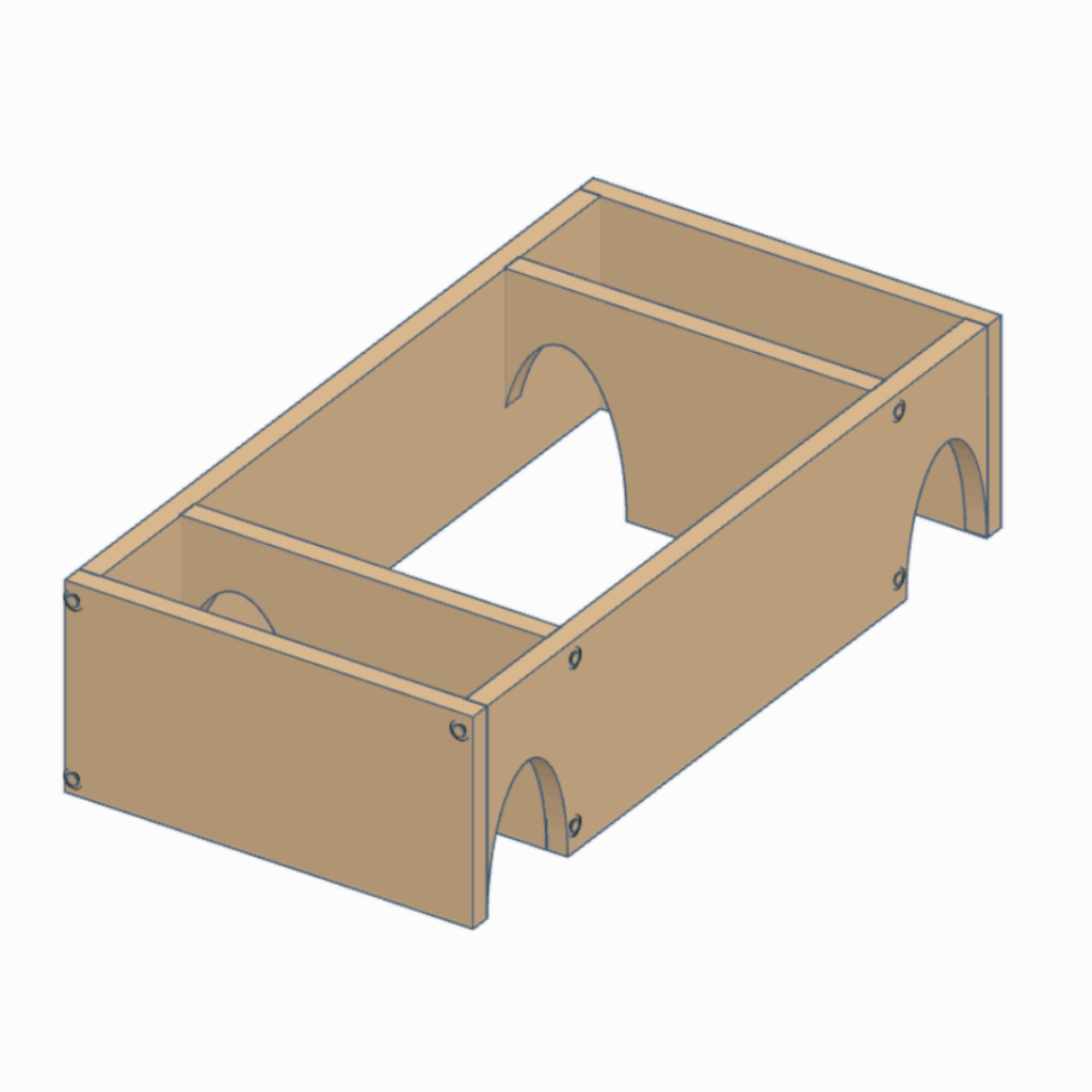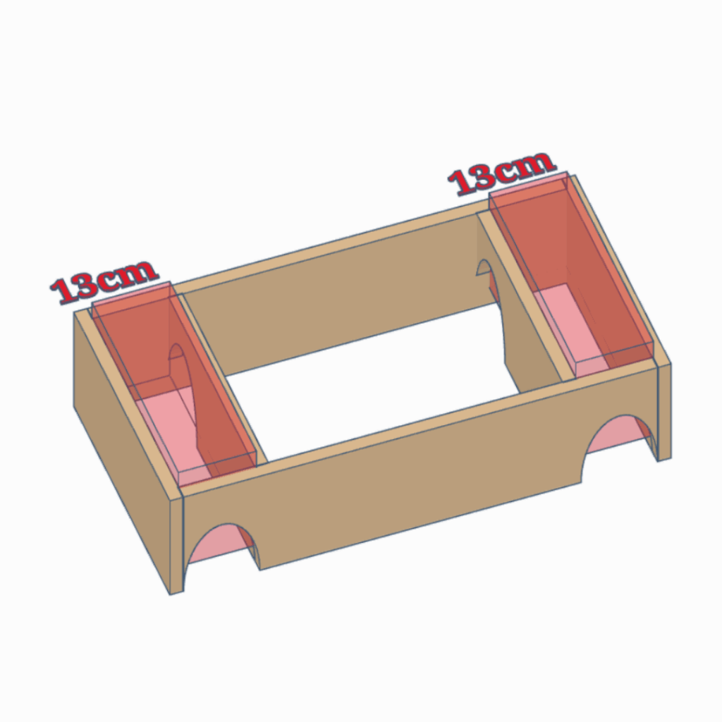 Controleer dat de tussenstukken 13 cm vanaf de zijkanten zitten zodat er 2 tunnels ontstaan. Als dat het geval is, schroef deze dan vast. Vanaf de voorkant kunnen er 2 schroeven gebruikt worden en vanaf de achterkant 1 schroef.