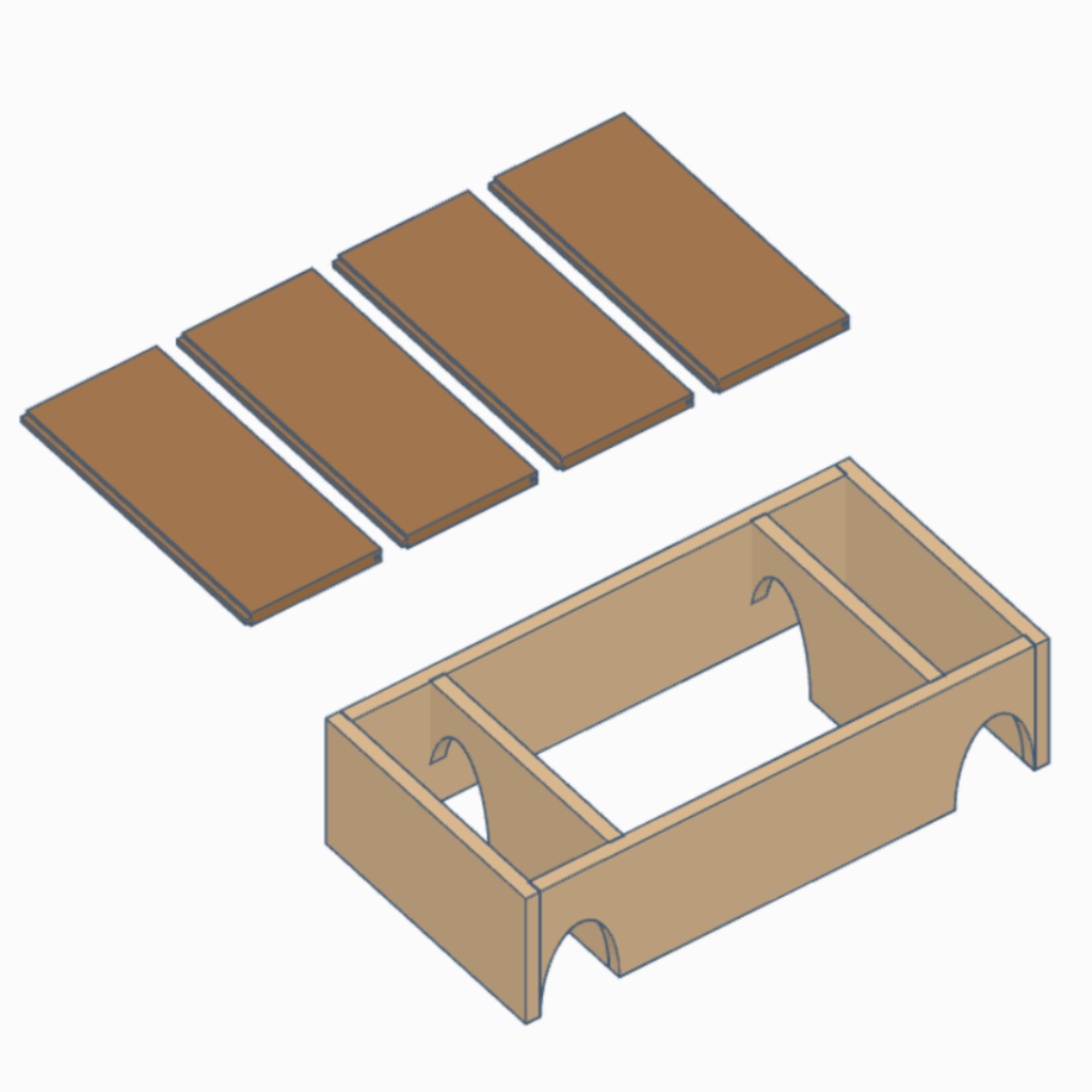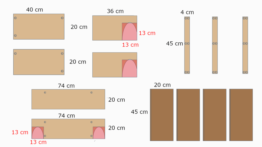 | Onderdeel | Aantal | Lengte (mm) | Breedte (mm) | Dikte (mm) | Houtsoort |